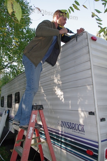 It’s conceivable that the solar panels could simply be kept mounted and lashed to the side of the camper for travel, but I’m uncomfortable with that at this point. Thanks to work by my son Tom, the hangers have proven to hold tight even when the rail-mounted loops were bent down from accidental abuse during initial usage. But it’s a gravity-based system, and is simply not intended for holding the panels during bad roads and high air speeds. Not going to try it. It would really need a completely different permanent-mount hinge system with locking catches at the lower end of each panel.