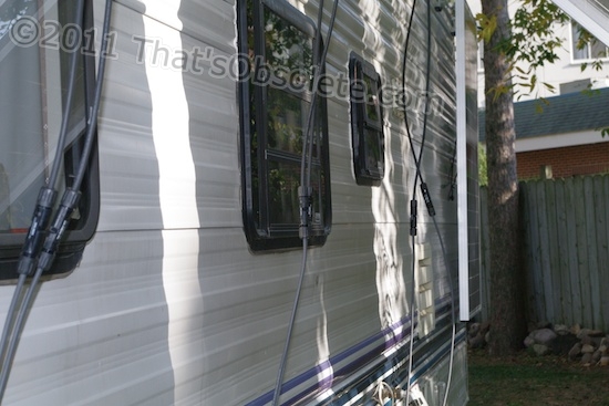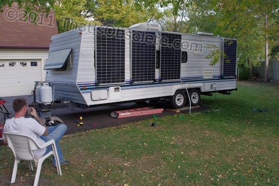 The inherent drawbacks with this type of system keep me from claiming that anyone else should use it as well. It only suits my particular situation, and my tolerance for inconvenience. Those big solar panels weigh 40 pounds each and must be stored inside the camper when not in use – there’s just no space available anywhere else. As a result, they clog up the passageway between the living area and the front office. You have to suck in your gut and shuffle sideways to get past them. They also have to be placed directly over the frame, because stacking them against the outer wall causes the floor to droop just enough to warp the outside doorway a bit, making the door bind. That could be an age thing. Between the weight of the office batteries and books, and the solar panels, the hitch is carrying a lot of weight – more than it should. It doesn’t seem to be causing any problems, but I wouldn’t recommend attempting to tow this camper with a 1500-class pickup.