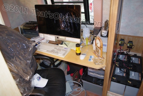 An early shot of the forward office area showing two pairs of 100Ah deep cycle batteries on a platform in the front closet floor. Yes, a 27″ iMac is an idiotic choice for an RV, but it’s what I already had.