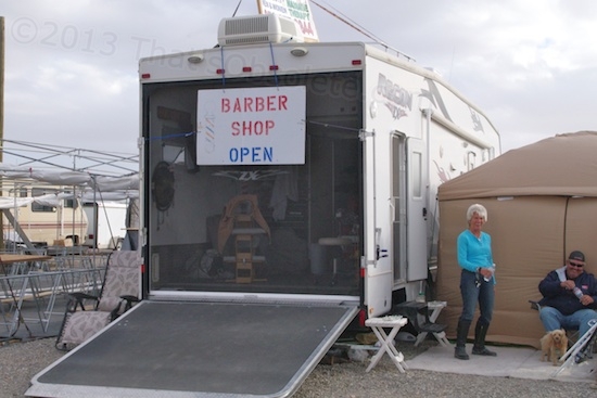 That turned out to be Donna, who works out of a converted Jayco Recon ZX toy hauler (a travel trailer built to include space for motorcycles or ATVs in the rear). In her rig, this space was now her barber shop and massage therapy office. All she has to do to open for business is to pull down the big loading ramp and the huge screen that can enclose the rear opening. An 8′ x 8′ window is not a bad view while you’re getting your hair trimmed, I can tell you.