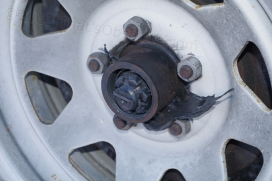 that I couldn’t identify. When I found my place and parked to chock the wheels, I noticed that one wheel looked askew and the plastic hub cover was gone. The outer wheel bearing had collapsed and lost its rollers. How long ago? I can’t say. A remnant of the hub cover had melted from the heat. The fact that I made it here without something catching fire or falling off is a blessing. You can call it lucky, if you prefer.