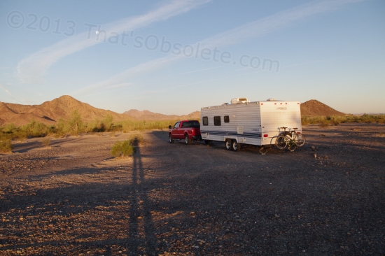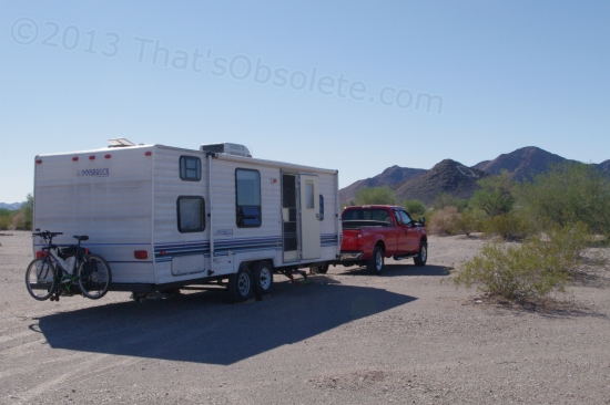 As always, this day’s episode is a mixture of uh-oh and wow. The wow is that I went to the restaurant I overnighted at and had a breakfast of diced hame in scrambled eggs, hash browns, a biscuit and gravy, and coffee. Very well prepared, and very nice people, too. Drove the 25 remaining miles to the Bureau of Land Management’s (BLM) Quartzsite La Posa West LTVA desert dispersed camping site, paid my $180 to park here until April 15, dumped the waste tanks, filled the fresh water tank, and settled into a decent spot. They say it gets obnoxiously crowded by mid-January, but that’s then and this is now. My nearest neighbor is at least a football field away. I picked a location that would let me easily bike to town just north of here on the other side of I-10, so I won’t have to crank up the truck for every little thing I might need. As I type this, the cabin temperature is 75 degrees, and there isn’t a cloud in the sky.