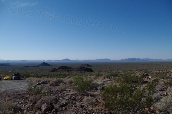The other 180 degrees of view is the great Sonoran Desert, which is vast. At the left edge of the photo is a tent next to a small car. A nice young couple was tent camping, and it was good to see campers other than old farts like myself in RV’s. Those tended to be down alongside the access road. Camping is allowed for 14 days here, free, which is perfect for people who will only be out for a short time. This couple had a skinny little white hound that protested my presence with a squalling bark by running near. When I figured out it was just doing its job and wasn’t really all that interested, I ignored it to look at the canyon and it wandered up to be petted, lazily wagging its tail. Then it fell asleep on the gravel near the Ford. Because the parking area here was a very large turnaround, it’d be great to stay here in the Enterprise, but the lot is sloped a bit too much to do that. These guys had the right idea.