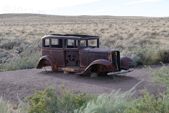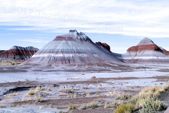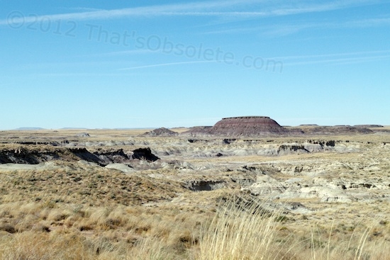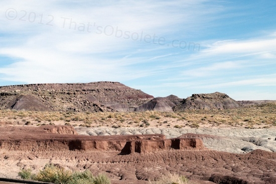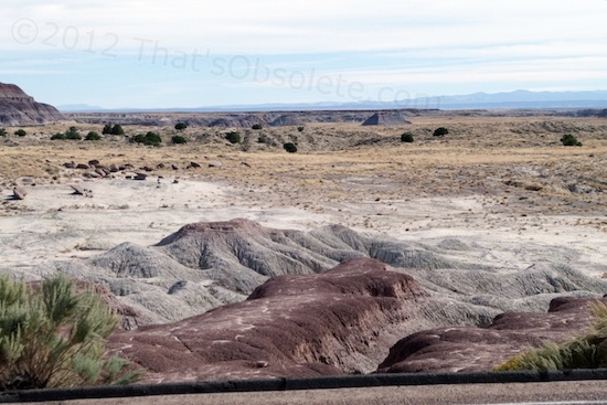 Tuesday, October 23rd was my first full day of touring the Petrified Forest National Park. I’ve mentioned the driving views from the road that goes through the park. Maybe it’s the economic depression that we don’t officially have, but not many people are at the park these days. I’m told that the prime season ended in September. At any rate, traffic along the roadway is almost nonexistent. For the sake of really taking in the scenery, that’s good, because there are very few places to stop at roadside, since there’s no room for a gravel shoulder. When you want to stop and gawk or take a holiday snap, you have to barely drop two wheels off, or just stop as-is. Either way, you’re blocking your lane. With no one in sight for several minutes, this is not an imposition.