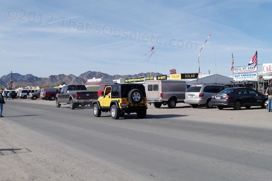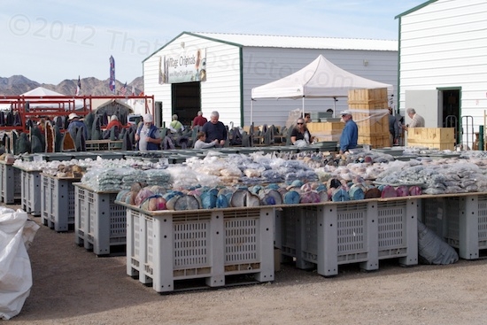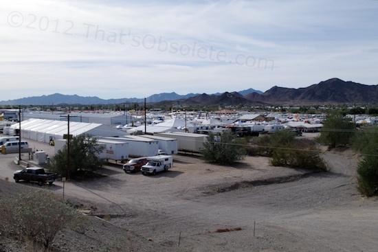 This is the back end of the main gem show area, shot from a bridge overpass. Vendor tents are in the foreground, while show-associated RVs are further back on the right.