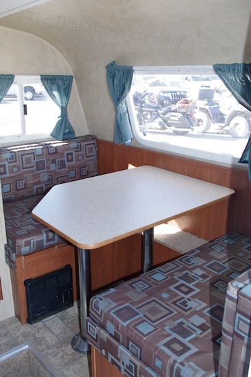 The forward end has a workable dinette, and a tiny wet bath is just to the left. No sink in there, just a shower and toilet. You wash your hands at the kitchen sink.