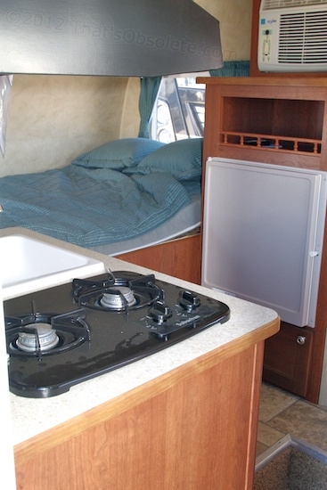The back end has a kitchen and bed. A center step-down floorwell allows standing upright in the main area. Most everywhere else is a sitting or lying area anyway.