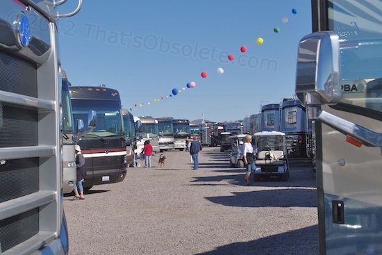 That doesn’t seem to stop the vendors so far though. The “Big Tent”, a huge vinyl structure was still packed with vendors and visitors, and the range of alleged health products, RV-related equipment, camping resorts, and prepared foods was impressive on opening day. As always, the sheer number of dealer’s motorhomes and fifth wheels parked on the surrounding lots was staggering. Unlike the motley assortment of vendors that surrounded this area, there were good deals and “show specials” to be had if you just looked hard enough.