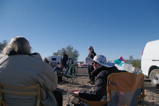 As I mentioned at Thanksgiving, there’s a group of campers, the vast majority full-timers, who’ve gathered together for camraderie, friendships, and knowledge. Nearly all of these folks make me appear to be Mr. Luxo Tubby in my 26′ travel trailer, because most dwell in vehicles ranging from class-C motorhomes, to smaller travel trailers, to converted small cargo trailers, to converted vans. They’re more than willing to trade a lifestyle based on affluence and comfort for one of freedom of choice. That’s a vast simplification of course, but each person I talk to has a depth of presence and satisfaction that’s hard to find anywhere else. Most folks are waiting and planning for the day that they might be able to do what they like, and perhaps experience living rather than merely putting in time for the day when they can. There’s a sense of joy and enthusiasm in this bunch, even among those whose financial circumstances don’t allow too many other options. Unlike me in my big luxo trailer, they can go where they like and stay where they like, be it open desert at the end of a rough trail, or urban area.