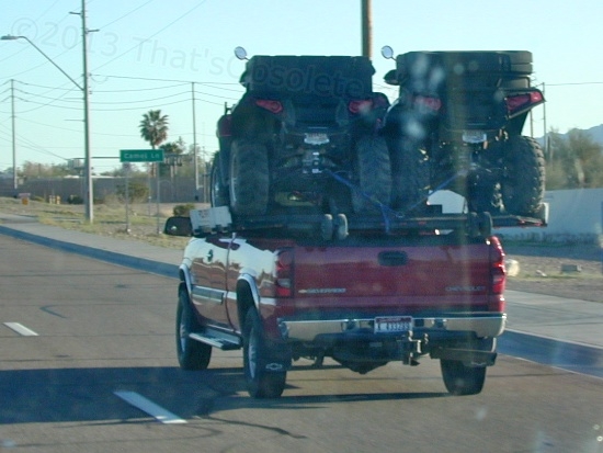 I’m finally learning to pack a camera full-time, in this case an old 1998 Nikon pocket camera which has its problems but still mostly works. In this case I was returning to Quartzsite from a grocery shopping spree in Parker, and saw some guy very carefully pulling out from a sidestreet. He was being careful because each of those ATVs probably weighs about 600 pounds, and with their center of gravity six feet in the air, even dodging a pothole can be interesting.