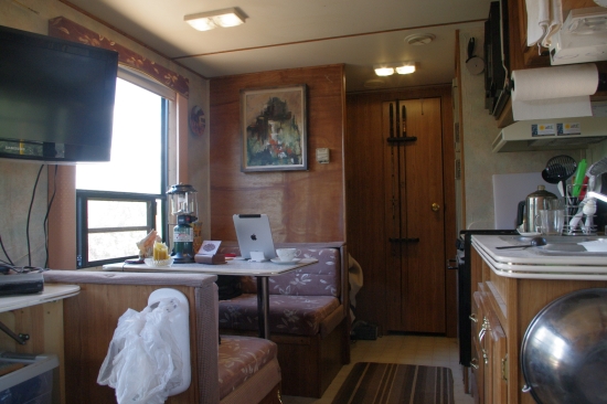 The kitchen area as viewed from the couch. All lighting except the range hood is now LED. The bunkbeds are behind the wall. The bathroom door holds 3 of my 5 fishing rods – the others are above the main entry door. Man-cave.