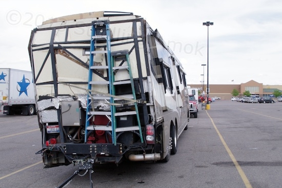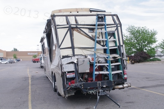 Just in case you’re not sure, what’s wrong with this picture of this uber-buck, high-end motorhome? Yes! It’s bent and the front end is now plywood and plexi.