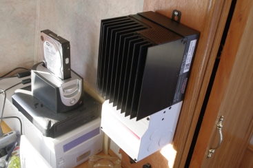 The Modular Approach dictated that the four cells be split into two independent systems to power all the office equipment, and this was accomplished with two small controllers mounted inside the closet. One panel, one controller, two batteries – times two. The closet wall next to the desk surface was populated with multiple cigar lighter-type sockets. A 300W inverter would allow everything needed to run. Done.