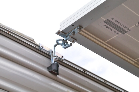 It’s a nice setup you have–I’m envious! I only have 500 watts on my class C. One question: do you worry about theft? Seems as if one of those panels would be pretty easy to lift off and walk away with. Having had a portable generator stolen when I was at Quartzsite a few years ago, I’m conscious of such things.