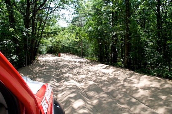 All roads in the area resemble this once you get within a mile of the beach. Heavily wooded, narrow, and mostly firm-packed sand. Enchanting. This is one of the flattest sections, and some are narrow enough that the truck had no wiggle room.