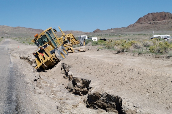 Lest you think that nothing goes on when you’re boondocking in the middle of nowhere, apparently nowhere is a happenin’ place! Offered for your consideration is this grader, which was moving dirt from the high ground to slowly fill in the deep void near the roadway when the earth collapsed, tossing the rear end into the ditch. The driver thinks that if it weren’t for the wide blade, it might have gone onto its side. They tried to pull it out forward with another grader that was onsite, but it couldn’t find enough traction on the dirt. So, the driver is now traveling about an hour and a half to get a bulldozer. I can tell you, at 77,000 pounds with such a steep drop and a lot of ground contact, it won’t be easy to get this thing out. That should be entertaining. I’m charging the videocam batteries now…