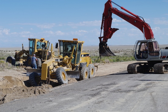 Wow, what a project to get the grader free! It took over an hour, and the problem was the grader’s weight. They decided to try to pull the grader out from the roadway side, and filled in the trench all ’round so that if it moved, it would go only more level ground. At first they tried to use the crawler’s bucket to pull at the rear end of the grader, but the leverage problems quickly made it apparent that power was lacking. Once they added a second grader with more cables, the back end came out of the hole and she was up and drivable. The tracks on the crawler didn’t do the pavement any good, but damage was minimal.