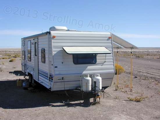 Nothing spectacular today, which is nice for a change. The daytime temperature edged back into the 70’s today, and since I was already out to pump the camper’s waste tanks into the Tankmin in the Furd, I went for a 2-mile walk down the road heading for the Salt Flats. There are two 12-inch pipes coming out of the ground, each a hundred yards from the roadway. There must be a heckofa pump or two somewhere, because the flow rate out each of those pipes is impressive, and they flow 24/7. It seems that a potash plant on the other side of I-80 is returning leftover brine back to the salt flats.