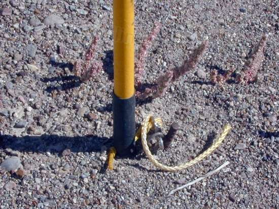 This is the bottom of the #1 support pole. The rope has a clip to make attachment to the looped spike easy and quick.
