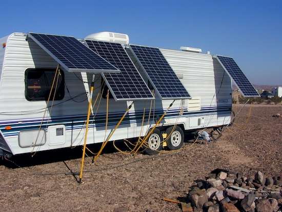Still, you can imagine the losses a panel mounted flat on an RV’s roof would suffer. Many rooftop adjustables around here don’t have quite the reach to get to the optimum winter angle here, but they’re close enough. The one good thing about this Rube Goldberg system I have is that there’s no need to climb a ladder and stumble around on the roof!