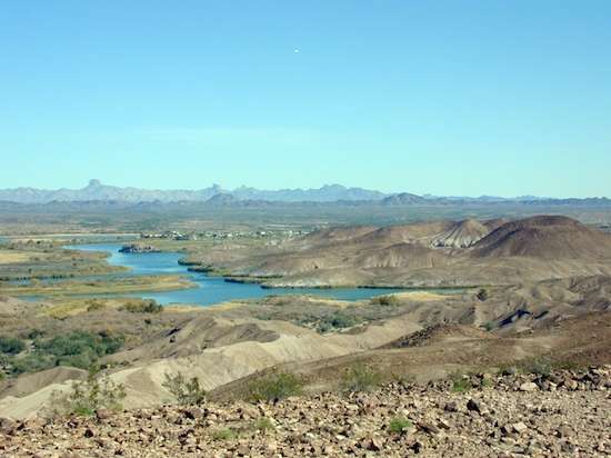 The little SUVs drove on, making good time, while I pitched this way and that as the Ford crawled along. Naturally, I was surprised to soon find them parked together on a pull-off at the top of a mountain pass. Then, I wasn’t surprised, because the view from there included most of Ferguson Lake below. It has to be the only lake I know of that isn’t overly developed. No town, and a few houses on the more hospitable side opposite. Ferguson Lake is attached to the Colorado River. Aside from the BLM trail I was on at the south side, there was no north side access trail other than one that seemed to come from the Yuma Army Proving Grounds. I’d come 8 miles from the Imperial Dam LTVA.