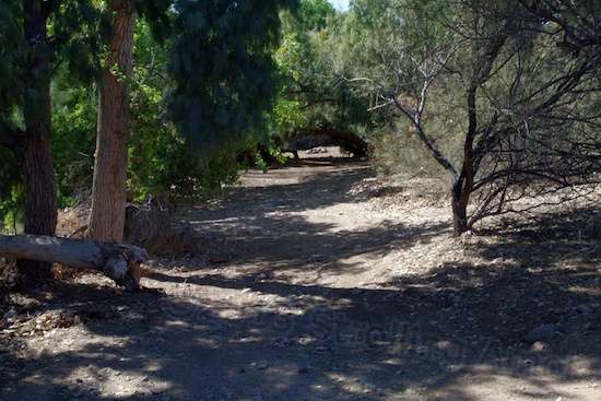 Would I stay here? If the Defiant were better able to adapt to two-week moves, yes. Mind you, I’d go to the considerable trouble of unhitching topside before diving down to scout for a likely spot and how to approach it. This is not an area that welcomes a blind tour with fifty-three feet of articulated tin. Motorhomes towing cars need not apply (because they cannot back up) – at least not without separating or taking a very careful toad tour first, looking for loops in the trail. A few areas presented a challenge just to the long-wheelbase Ford alone. Since this is water-level, there are a lot of bushes and trees to enforce each path’s limitations on both width and height. These aren’t your typical fluffy Midwest plants, either. They are unyielding bushes with paint-scraping thorns, and even the unarmed ones are easily tough enough to tear off whatever isn’t stoutly secured. A large rig like the Defiant can go down there – you just have to pick your battles first. The driver of a small van-based motorhome or hard-sided truck camper need only stay awake and thoughtful in wending through. A pop-up truck camper, van or car has the run of the place. Neither high clearance nor 4WD are needed unless you decide to do something risky that might involve deep sand, slope, and/or water. This area is very usable, but not stupid-proof.