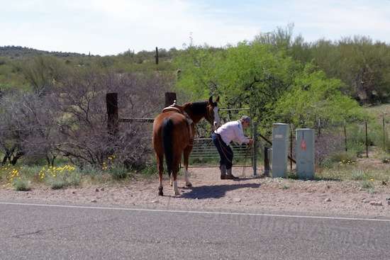 Here’s one woman just returning from a pleasure ride on a Tuesday afternoon. Her horse was deeply suspicious of my bicycle (as wild burros are) so I laid it down on the ground until they passed. The woman told me that she’d seen some cactus beginning to bloom out there. Her horse looked to still have its winter coat.
