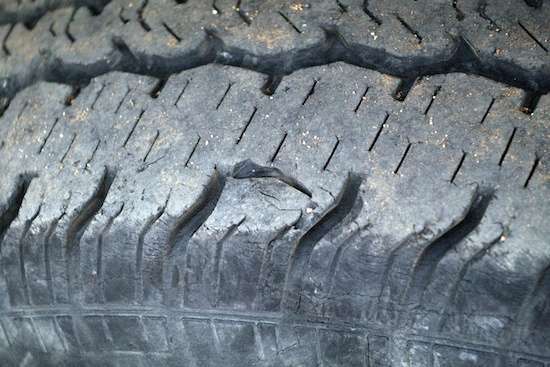 Then squirming under load, more impacts and heat undermine the sun-rotted rubber to tear out a chunk.