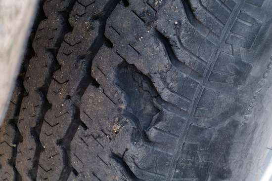 I was okay with that, within reason. The  main thing to be dreaded with losing chunks of rubber is exposure of the steel cords underneath.That can lead to rust and disintegration of the tire’s structural carcass. Under 75 or 80 pounds per square inch of pressure, the tire goes out with a bang instead of a whimper, flailing a lot of heavy rubber that can do plenty of damage at speed. But how often does a tire see rust-accelerating moisture down here? Even so, budget or no budget, it became obvious even to me that I’d be nuts to keep pushing these tires. They’re cooked.