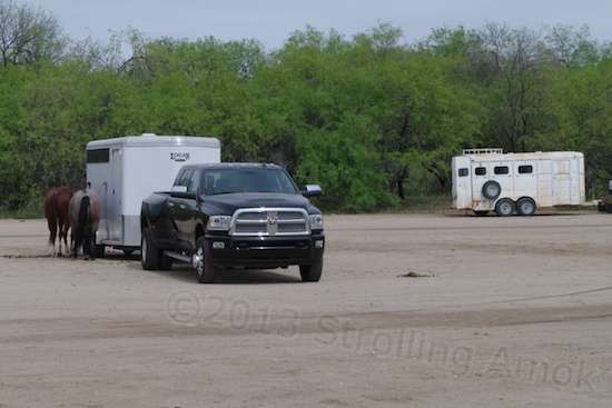 There’s a five-second penalty for roping only one rear leg, and same for either rider leaving the train station early. The equipment is not particularly specialized except for the two ropes. Once you see the photos below, you’ll know why. Each rope does a different job and must behave just so in order to succeed. You’ll notice that the steers are wearing protective horn wraps, which prevent rope burns and reduce stress on the horns. I’m very glad I took plenty of sequential photos, because that made it possible for me to see just how absurdly difficult team roping is to do well. It also helped me appreciate just how much training and experience the working horses must have in order to pull this thing off.