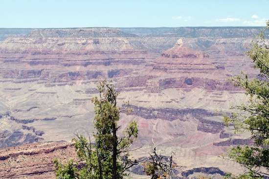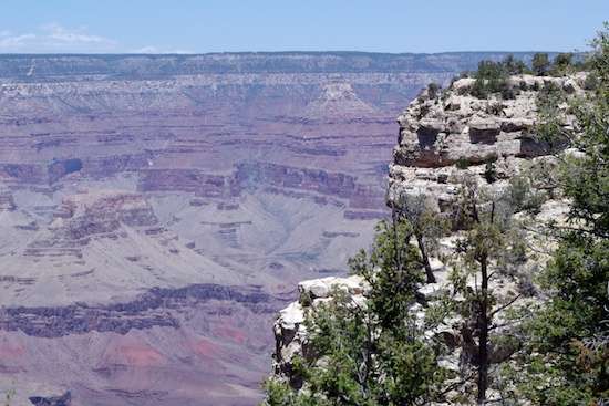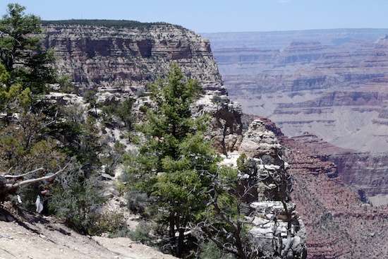 The path there was paved, clean and well-maintained, and the walk didn’t feel like half a mile. Then, bang. The path T-boned to the edge of the canyon, and although trees at the rim trimmed the number of viewpoints a lot, my reaction was a flip-flop. So many photographs of the Grand Canyon have been taken from the prime points at the prime times of day (sunrise and sunset), and then Photoshopped to pump up color saturation, that I was now looking at the natural haze within a vast basin, with most of the color comparatively washed out. Once I accepted that I had been looking at hyped crap rather than reality, I enjoyed the reality. That thing is immensely huge, and incredibly deep.