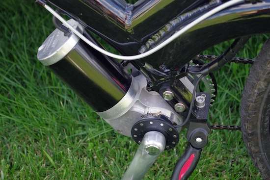 The Tonaro mid-drive is pretty compact and drives only the front sprocket (on the other side), not the pedal crank. That’s yours to rotate. Or not.