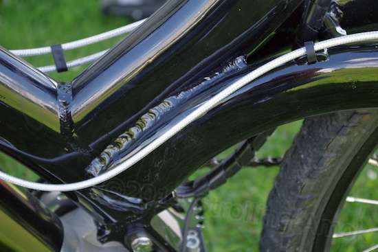 The Aurora’s frame is pretty, graceful, fairly stiff, and has no triangulation at all, even between the seat post and the rear axle. How’d they manage to accomplish that? They upsized the tubes, bulked up the tube wall thicknesses, and ovalized their shapes to better resist bending forces, which is all each tube will ever see. The tremendous bending forces that result at each unsupported joint are combatted with plenty of tube overlap and enough welding to hold a battleship together. Compounded by having to also deal with the weight of the electric motor and the battery at higher speeds, the end result is visually massive. Get close, and it really stands out. Wow.