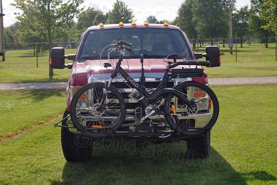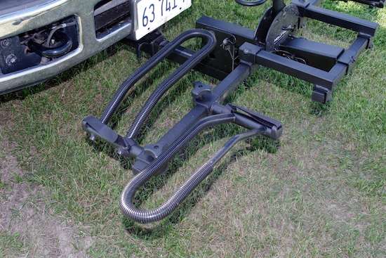 This particular Hollywood rack has some extra structure to deal with the twisting forces that concentrate onto the shaft that slides onto the hitch receiver, so it looks like it’s the best option by far. Running over your own dropped bicycle would be considerably worse than losing it off the back end of the rig, but at least you’d instantly notice the loss as it passed underneath, tearing out hoses and puncturing pans and fuel tanks. A sturdy front-mounted rack is not something to cheap-out on.
