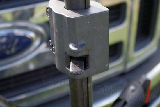 Another shot of the same area makes it clear just how tight the situation is. Some tape wrap on the pole may be in order to minimize paint damage, no? Relocating the trailer forward would eliminate this issue, but introduce a host of more basic and important problems.