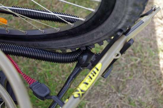 A piece of tape on the trailer fork helps protect its paint from the bike’s front tire, while the wrap around the platform loop intercepts the trailer kickstand.