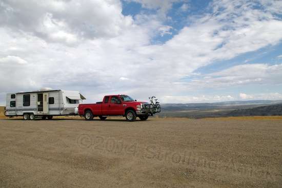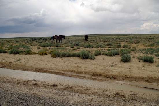 I had partially forgotten the sensation of driving up Wild Horse Canyon Road’s 1,300′ climb above Green River, Wyoming’s 6,100′ elevation. That’s enough to drop temperatures several degrees, and enough to make life very comfortable for heat-generating persons such as myself. The main climb is gravel over dirt, and four thoughts kept churning in my mind during the ascent. The first was that Wild Horse Canyon Road is almost exhilarating to drive up, since the views presented during the unrelenting climb are impressive. The second thought was of course wondering if I’d once again see any wild horses. Were the two I saw last year a fluke? Third, the road itself prompts a mental note to take the descent seriously when I leave. The Ford’s brake module failure has decreased the amount of braking that the trailer alone can contribute. That alone is unlikely to pose a problem, but a wet descent could. Fourth, the slow climb, rough in many places, was such a crawl as to prevent locking up the torque converter. “I hope it’s okay with this long a period of stress”, I thought to myself. The trans temp itself stayed unmoved from normal. You don’t need to know anything about torque converters to appreciate this concern, because all you need to know is that they are expensive to be replaced. Near the top, it occurred to me to put ‘er in 4WD Low, to ease the strain, and that worked out great. Fortunately, the first two thoughts dominated the others, and near the top of the initial climb, I was rewarded with the distant sight of a small herd of horses grazing upon a hilltop.