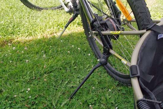 The Aurora’s kickstand can hold the unladen bike, and that’s about it. The Greenfield stand attached to the trailer fork does the job better, and tucks out of the way.
