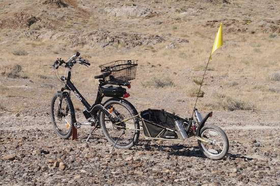 These days, riding the modified Aurora points out that the mods make it acceptable, but not quite fully there yet. The smaller front sprocket turned out to be the hit of the week, since even a mild jump from a 48 to a 44-tooth sprocket works wonders for hill climbing and launching uphill with a loaded trailer, all without running out of breath at top speed. The difference is unnoticeable in normal use, but stands right out when pure bottom-end grunt is needed. I found this out when experimenting with a shortcut across dried mudflats on the way back to camp with the trailer, when I hit a softer section. Down into it the tires went (less than an inch), and only the quick application of full throttle, downshifting to the lowest gear, and notable pedaling effort saved the day. (It was semi-firm stuff that simulated a steep uphill climb.) The battery was just about gone, and gave up before long, shutting down the drive system during the hard pull. No matter, I knew it would not make the entire trip and had packed the spare. In I went, and I noted that the first battery had survived 39 miles before dying, a notable accomplishment because of this mud and the previous 9-mile trip with a 100-pound load in the trailer.