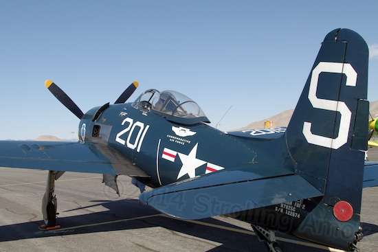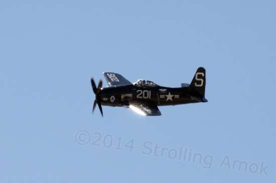 I was waiting for the big F8F Bearcat, and it did not disappoint. Fitted with the most powerful radial fighter engine then extant, it was a fast, tough fighter that built quite a reputation for itself in combat. A plus was that each fighter that went up finished with a slow idle up and down the flight deck right in front of the crowd, allowing for waves and some great close-up shots while the prop whirled around.