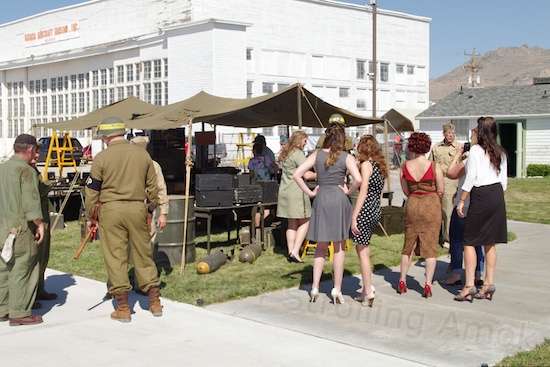 Three of those Friendly Ladies from Palookaville were serving cheesecake to an event photog in front of a WWII hangar.