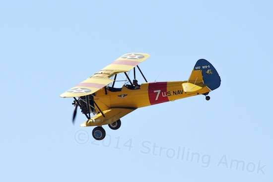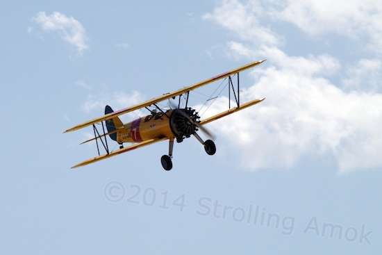 Up each went, one at a time. A bright yellow PT-17 biplane trainer went up first, a plane often used to get a new recruit used to the mysteries of flight. Then a T-6 Texan, a mono-wing trainer more like the modern aircraft of the time. I consider them kinda big and dumpy, but veteran pilots have a persistent nostalgia about this reliable, forgiving, and enduring aircraft. There are lots of them still flying. They tend to have a real affection for ’em.