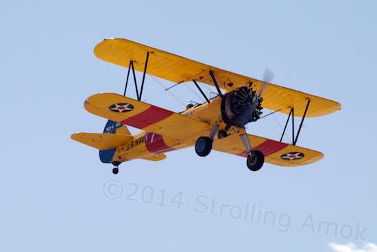 What seemed peculiar was Will “The Flying Tenor” Allen in his Pitts Special biplane, singing The Star-Spangled Banner into the field’s PA system as he flew around overhead. He had his own version playing, and used a mic in his helmet to belt it out, Vegas-style. Okay-y-y….