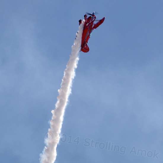 Then the Rocky Mountain Renegades, a group of seven pilots, put four of them up as a warm-up and did a few decent stunts with smoke trails in their wake. A guy in a ZLIN 50 stunter went up, too. Then Will “TFT” Allen went back up again in a long aerobatic show, and frankly, I’ve never before encountered anyone so impressed with himself. The charitable term would be self-confident. The tower (or player in his plane) was playing a rockin’ soundtrack which he himself had performed and recorded, all the while throwing his plane and narrating how excited the various stunts were making him, oh yeah! Woo-hoo! He was an exceptional pilot, his soundtrack was pure Vegas stage act and done competently, and I was promptly waiting for it to be over. The guys in the tower loved it though, because all they had to do was twiddle their thumbs for ten or fifteen minutes, and when Will was done, they thought it was fab, and threatened to bring him back again next year. Figures. When I want a Vegas act, I’ll go to Vegas. Maybe it’s just me.