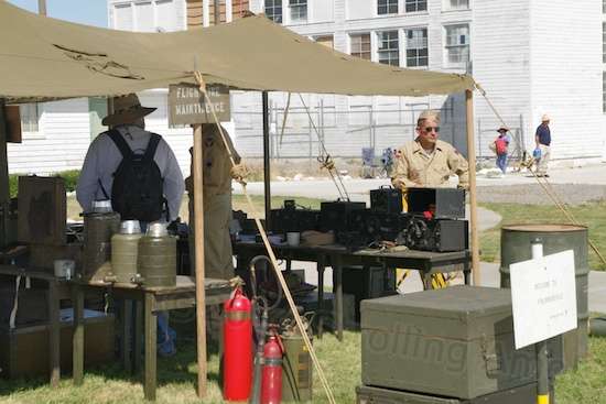 Reenactments Gone Wild? A sign reads, “Welcome to Palookaville” at an entrance. This display was charming, though the Friendly Ladies looked out of place to me. but not that many theatrical costumers or hairdressers moonlight for free at volunteer air show events in sparsely-populated towns in remote areas, so ya gotta go with what ya gots! The tarp, table and uniforms made me smile, and as long as you don’t kick a bomb on the ground, you’ll be fine!