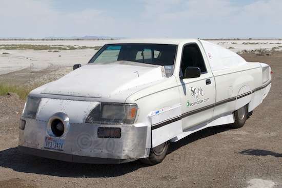 It is said that “speed costs money, so how fast would you like to go?” The folks who run on the salt flats every year strain their budgets to try to break speed records, and those budgets can get pretty sizable. So what’s an ordinary gearhead with little more than bread money going to do for fun and a sense of pushing the limits of what can be done? Go for fuel mileage that is above and beyond what his stock vehicle is capable of. It’s just a different form of fun and number crunching. So that’s why seeing this once-little pickup at the salt flats was such a trip. It looks like a streamliner, and it is. It looks faster, and it is. But these are merely the side effects of its true goal: fuel mileage, not speed. Different goals entirely, yet half of the path to get there is shared between the two. It can’t win any drag race but, unlike a similarly-dedicated speed racer, it can be driven on the street, and in traffic. Its tuning runs and incremental developments take place every day on the street, instead of once or twice a year on a dedicated racing surface.