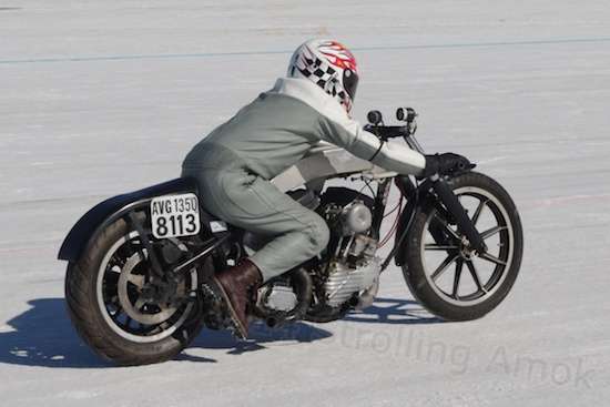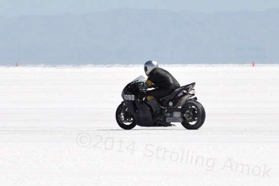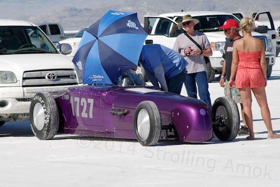 Hey, it’s a girl! I only knew thanks to the announcer and my telephoto lens. She did well on this weird-looking tiddler, and looked like she was having fun trying to stretch it out. Women drivers are not uncommon at Bonneville, from bikes to streamliners.