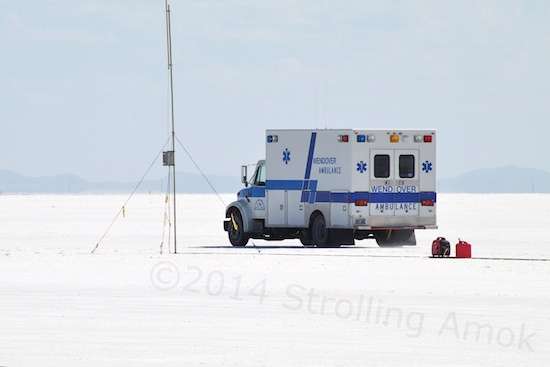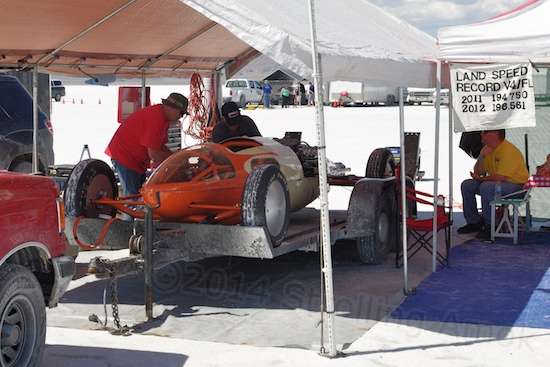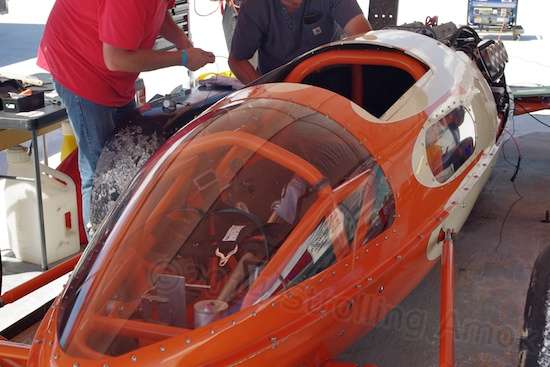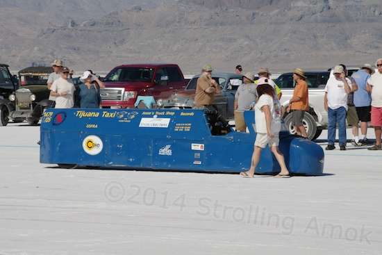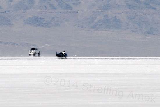 As long as you stay safely out of the way, you can hang around the launch point, or even wander down the side of the track several miles to see the racers fly past at speed. Naturally, the farther down you go, the further away from the track itself you are. Cones are laid out for miles, to define where to stay out of. I went down to the three mile point, but by that time you’re about a quarter-mile from the vehicle. The club broadcasts on a low-power FM frequency so you can follow who’s running now, and what their trap speed is at each mile marker, which helps a lot, especially when it comes near to or exceeds the existing record for that class. Naturally, I didn’t remember to bring my own little portable radio, but enough people parked downcourse under shading canopies had their radios on loudly enough for me to keep up no matter where I was.