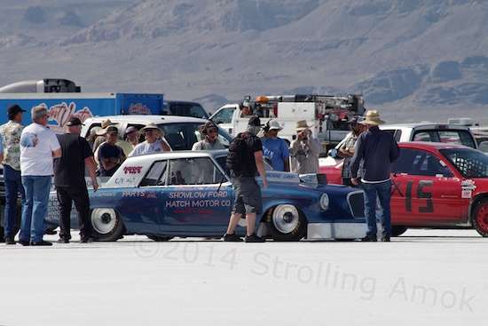 I’m not attempting to cover the day’s runs in this post, but simply relate my overall impression and show you more pictures than you want to look at. After all, this was the first and maybe only land speed record event I’ve attended in two years of trying. What’s it like? Laid back. These events are not really spectator events as such. Most of the spectators were family and friends of the participants. Each driver picks the course length best suited to his type of vehicle and gets in line. If you have an old VW Beetle (as many did), you pick the short course. If you have a huffed big-block Camaro or a streamliner, you pick the long course. Once at the front, an official radios your number in, and waits for the reply to release the vehicle for a run down the course.