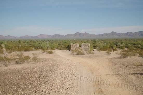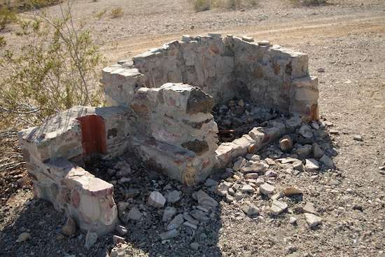 After slogging across the very broad wash, I was startled to see the remains of an abandoned cabin ahead of me. Roof and all wood long gone, this hand-built stone home had touches I would not expect. This cabin may perhaps be on some tourist listing for the Quartzsite area. Many of the listings are very vague as to location, and understandably lacking in history. The few hardy folks living here long ago were either miners hoping to strike it rich, or merchants hoping to trade off of successful miners. The native Americans that dwelled her have left far more traces of themselves. This cabin was newer and better-built than the few standing early buildings in the area.